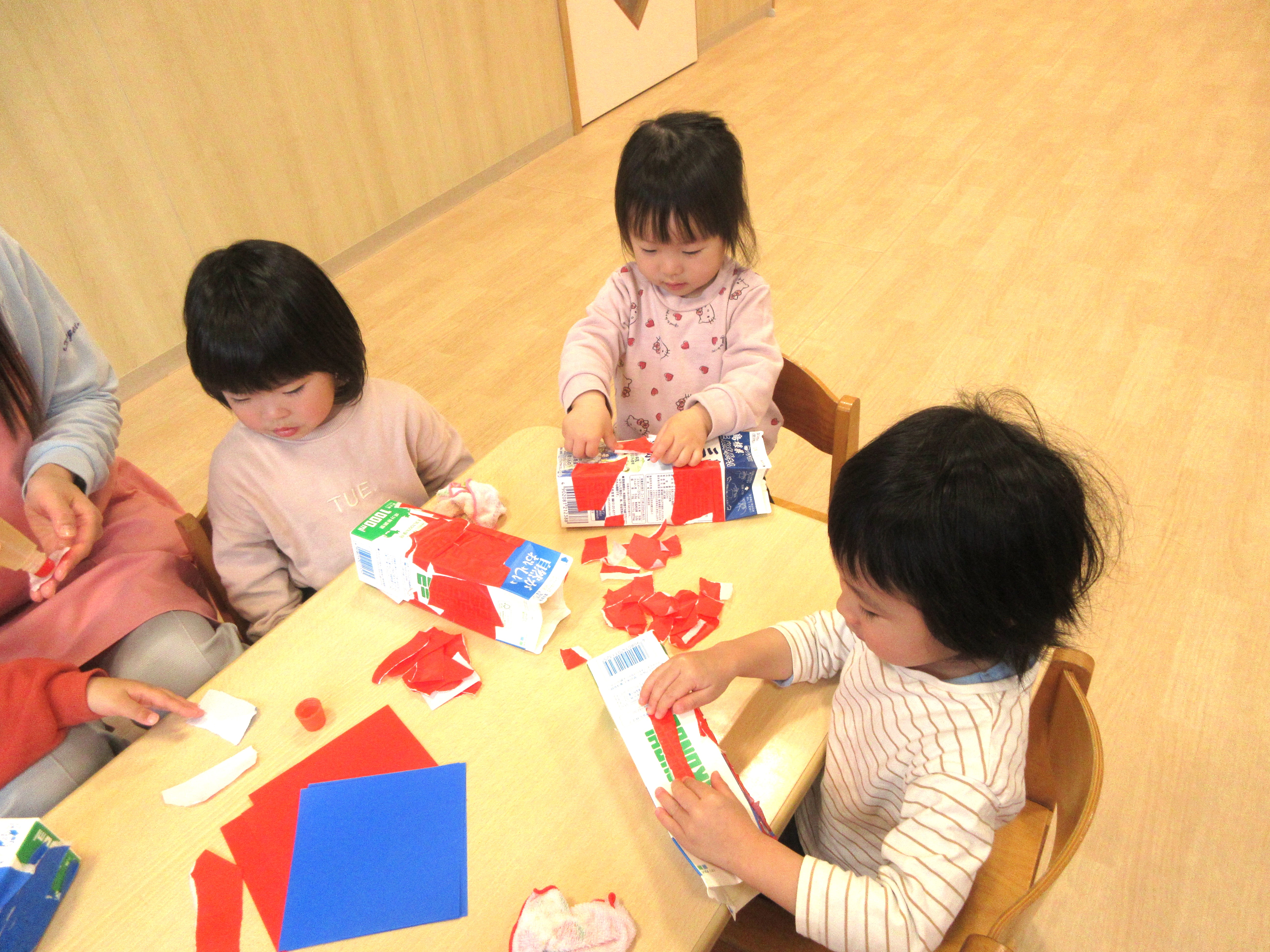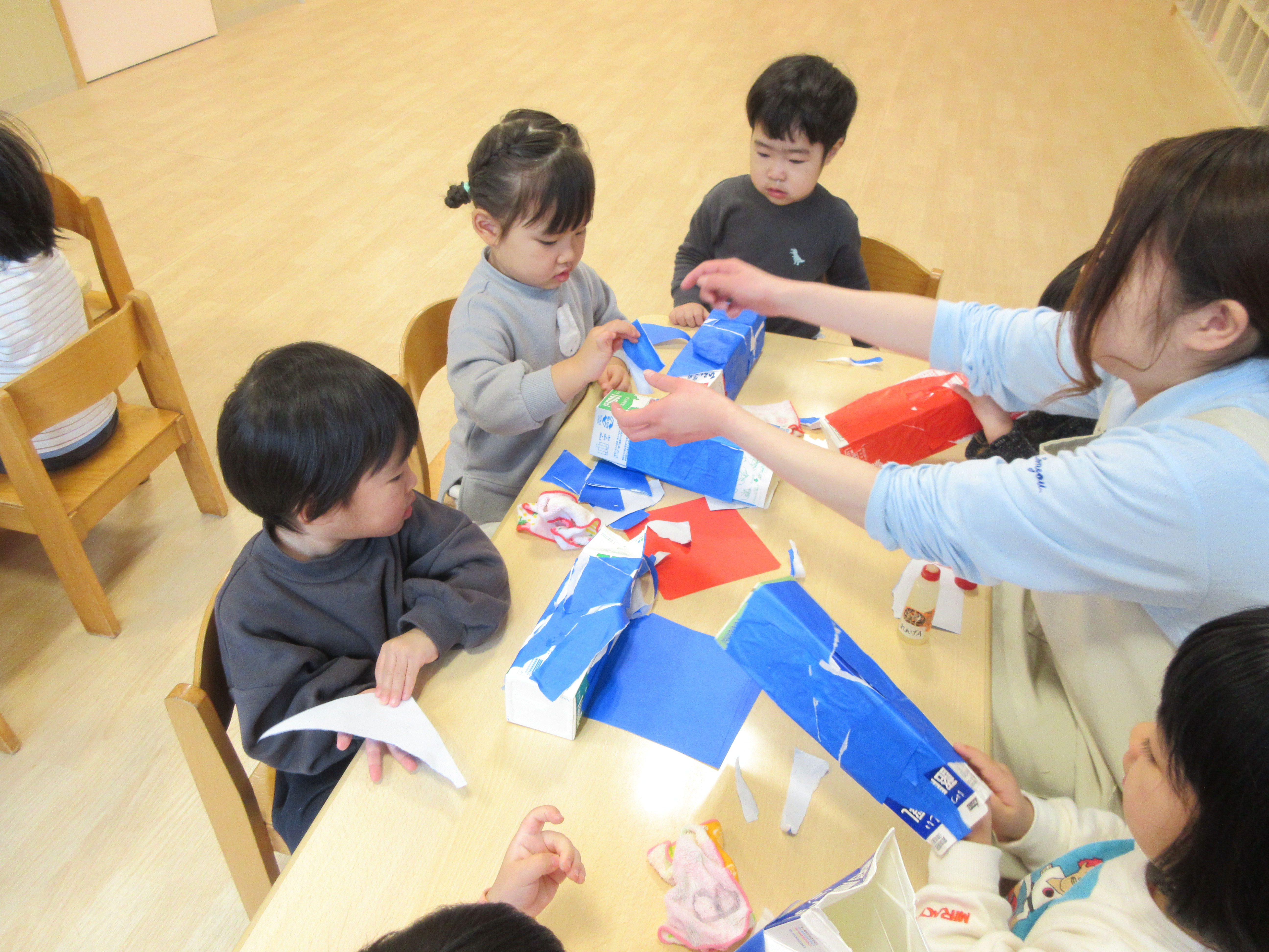 牛乳パックに折り紙をのりでペタペタ、みんなで一致団結して作っています。