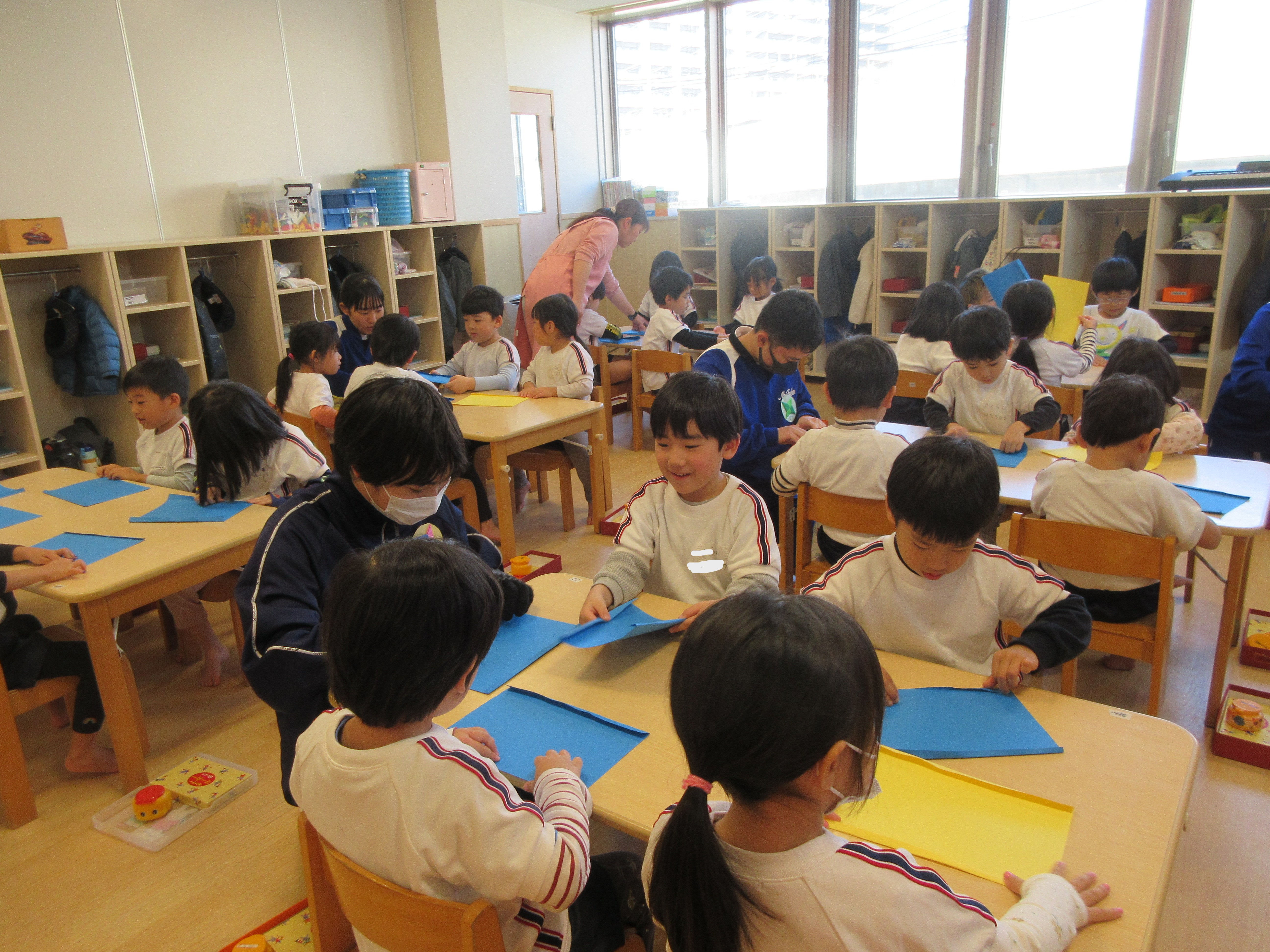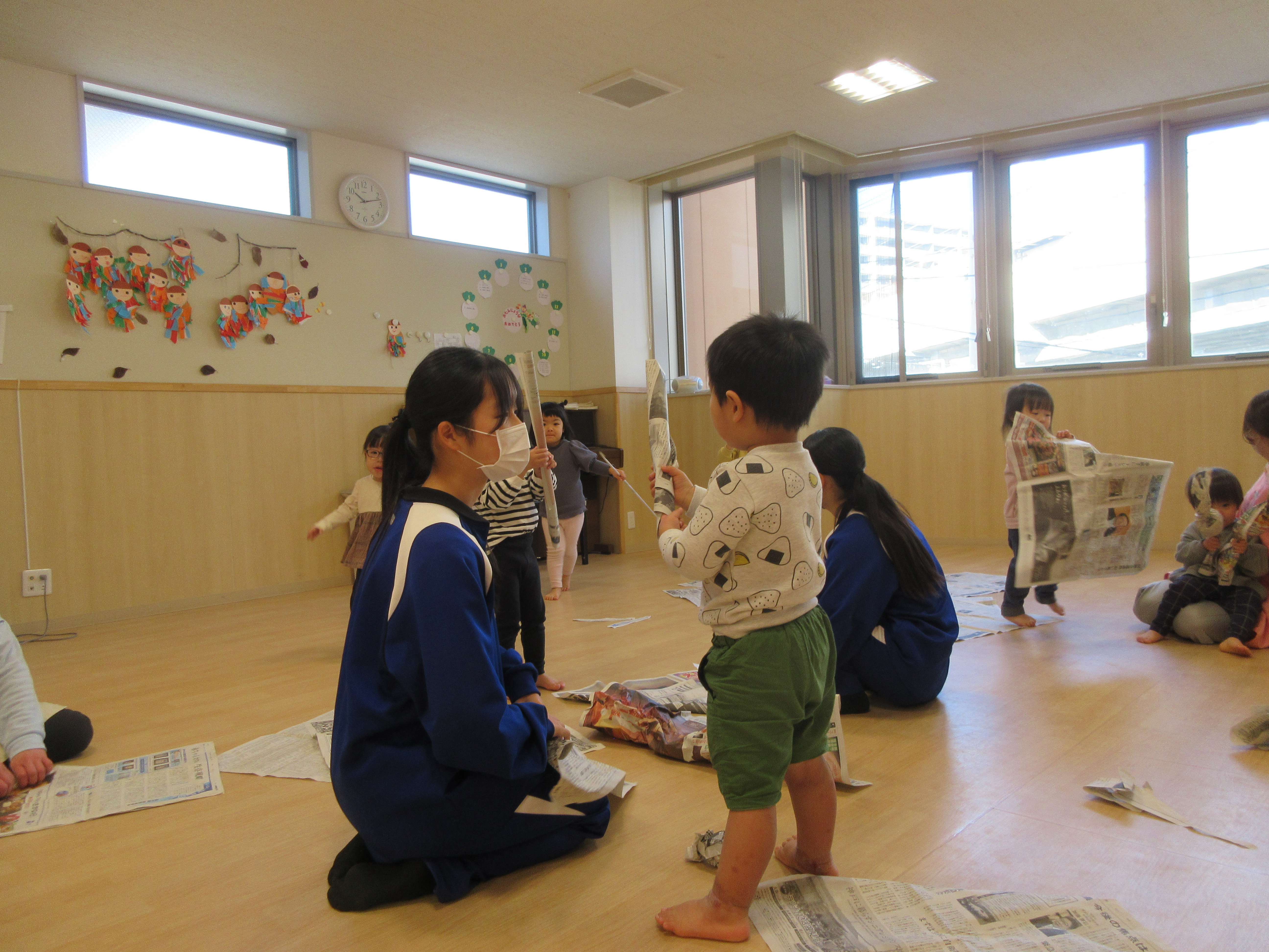 新聞や色画用紙で工作を楽しんでいましたよ!!