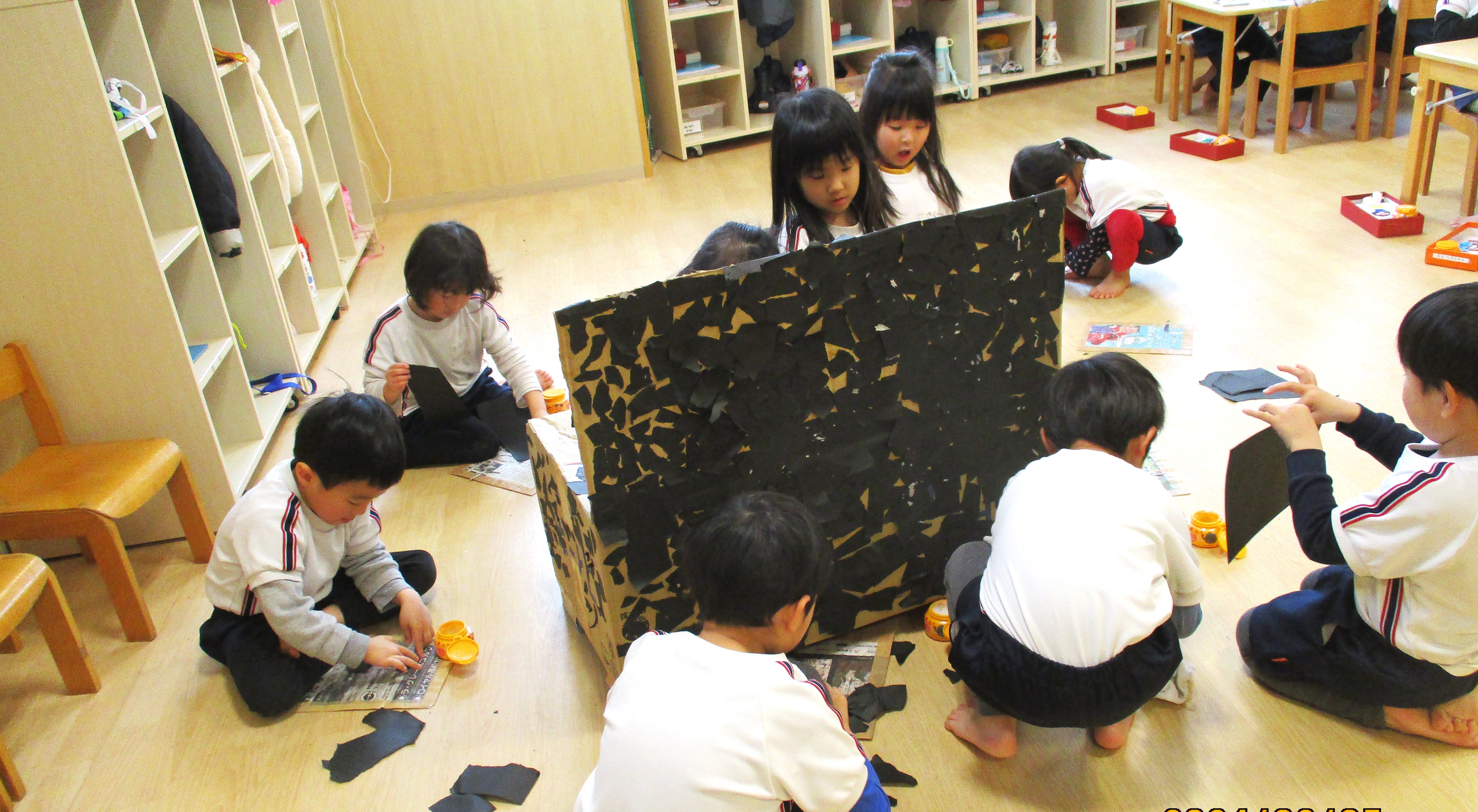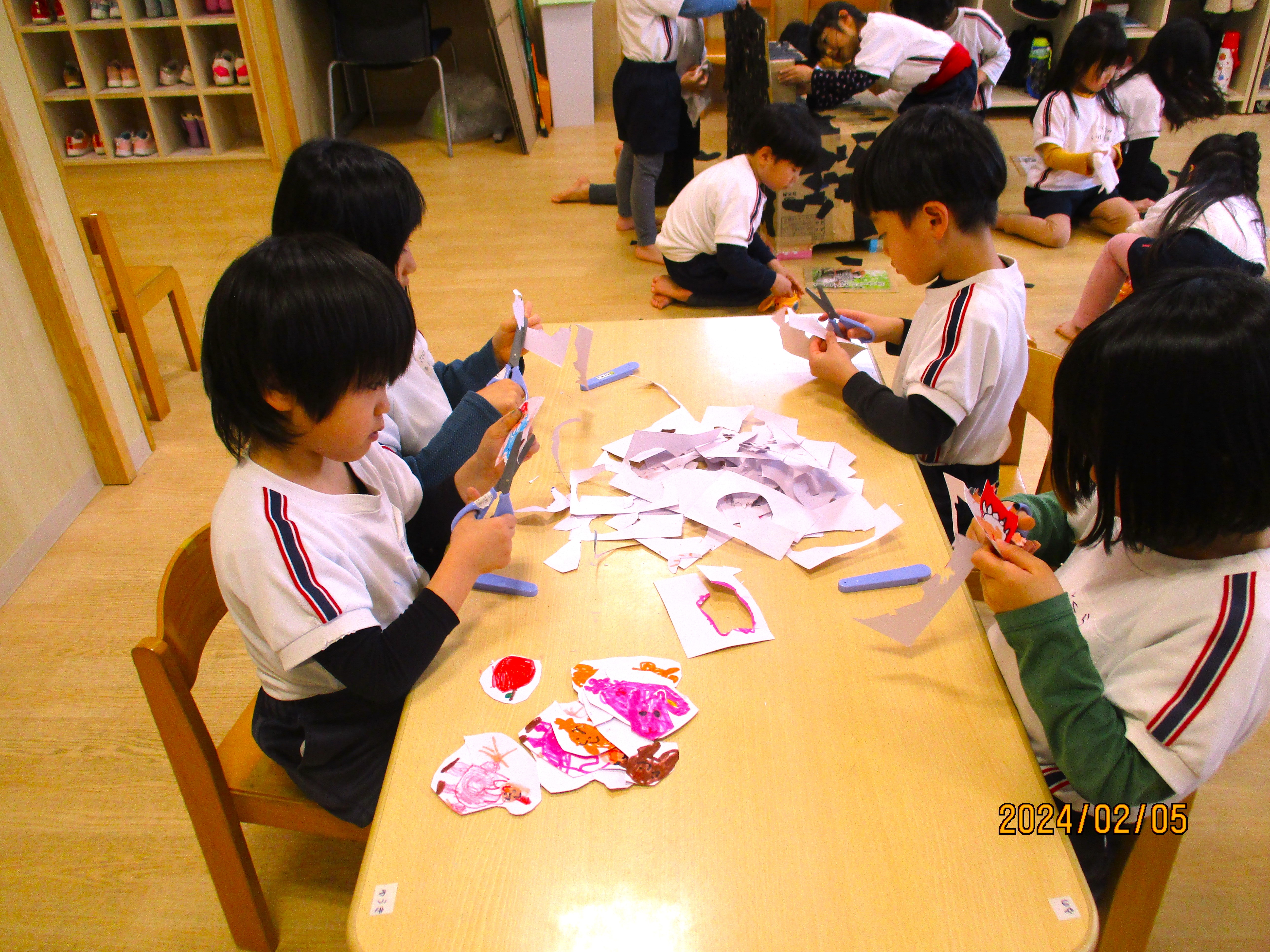 はさみとのりを上手に使って完成しました!!自分の作品と共同作品を最後まで作ることができ、みんな大変よろこんでいましたよ♪