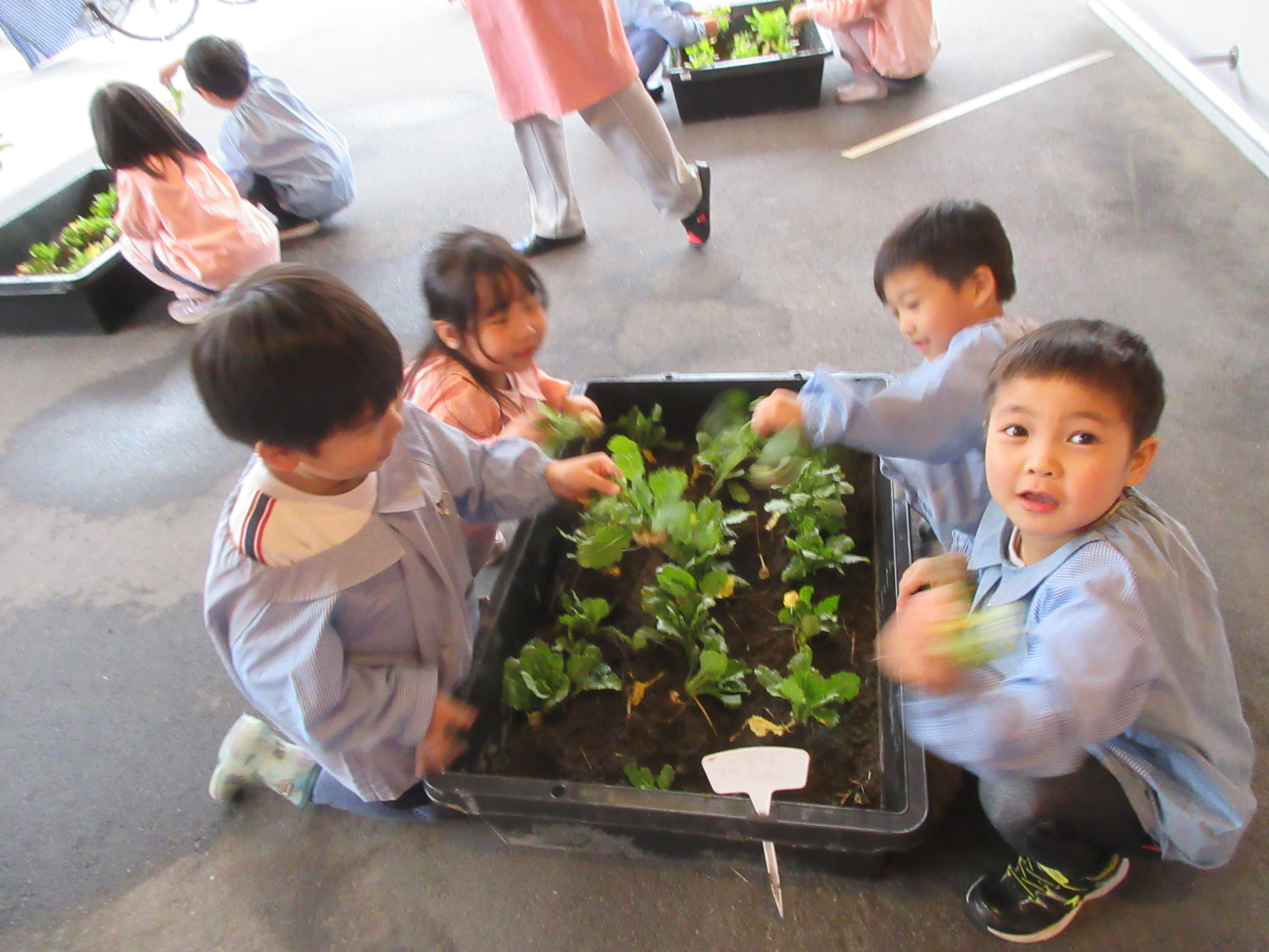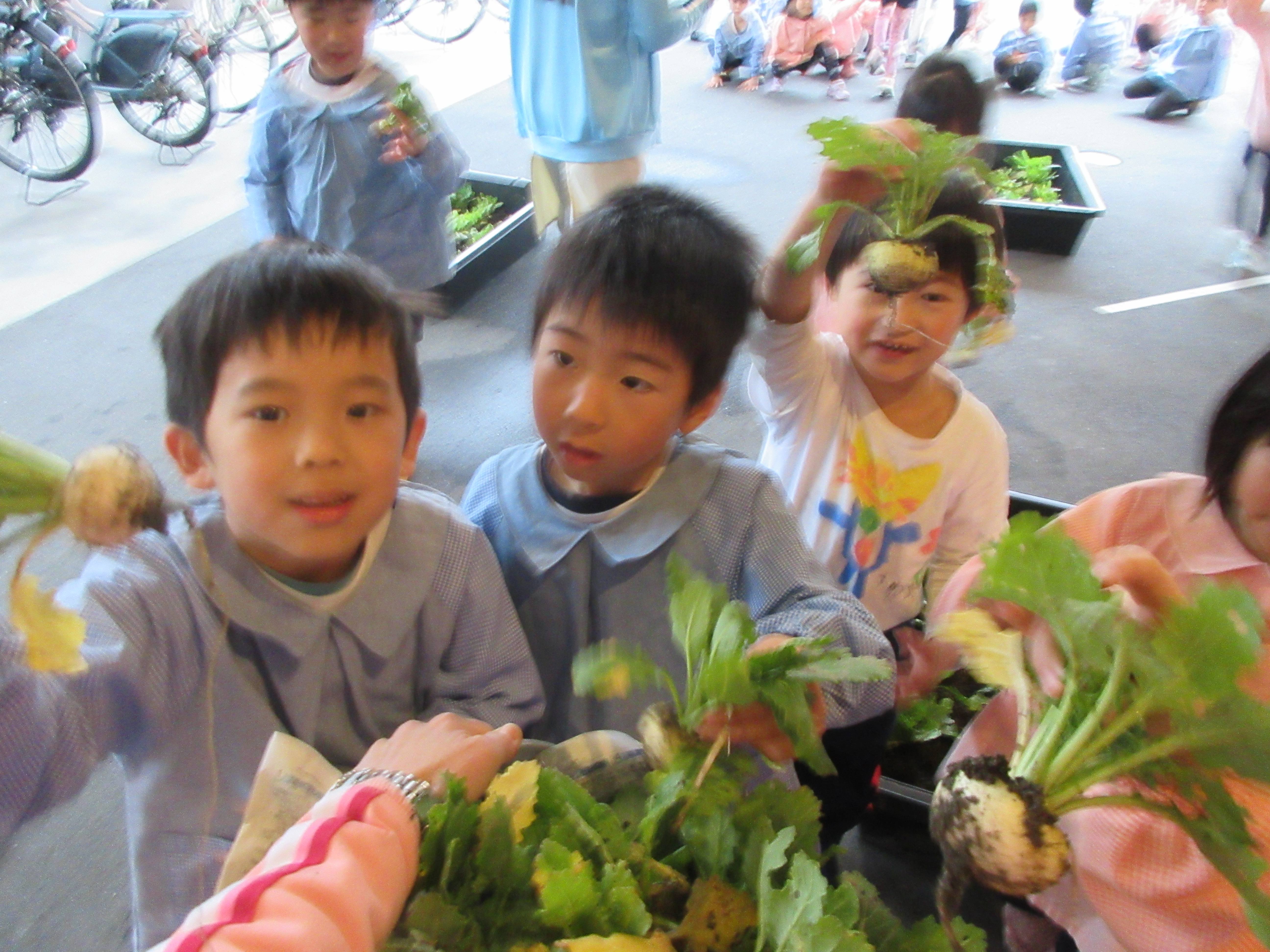農業体験で小かぶ堀をしました!天候が悪かったため、園での採取となりましたが、小さくてもしっかり「かぶ」でした。給食の先生に調理してもらい、スープとしてみんなの給食に入っていますよ♪