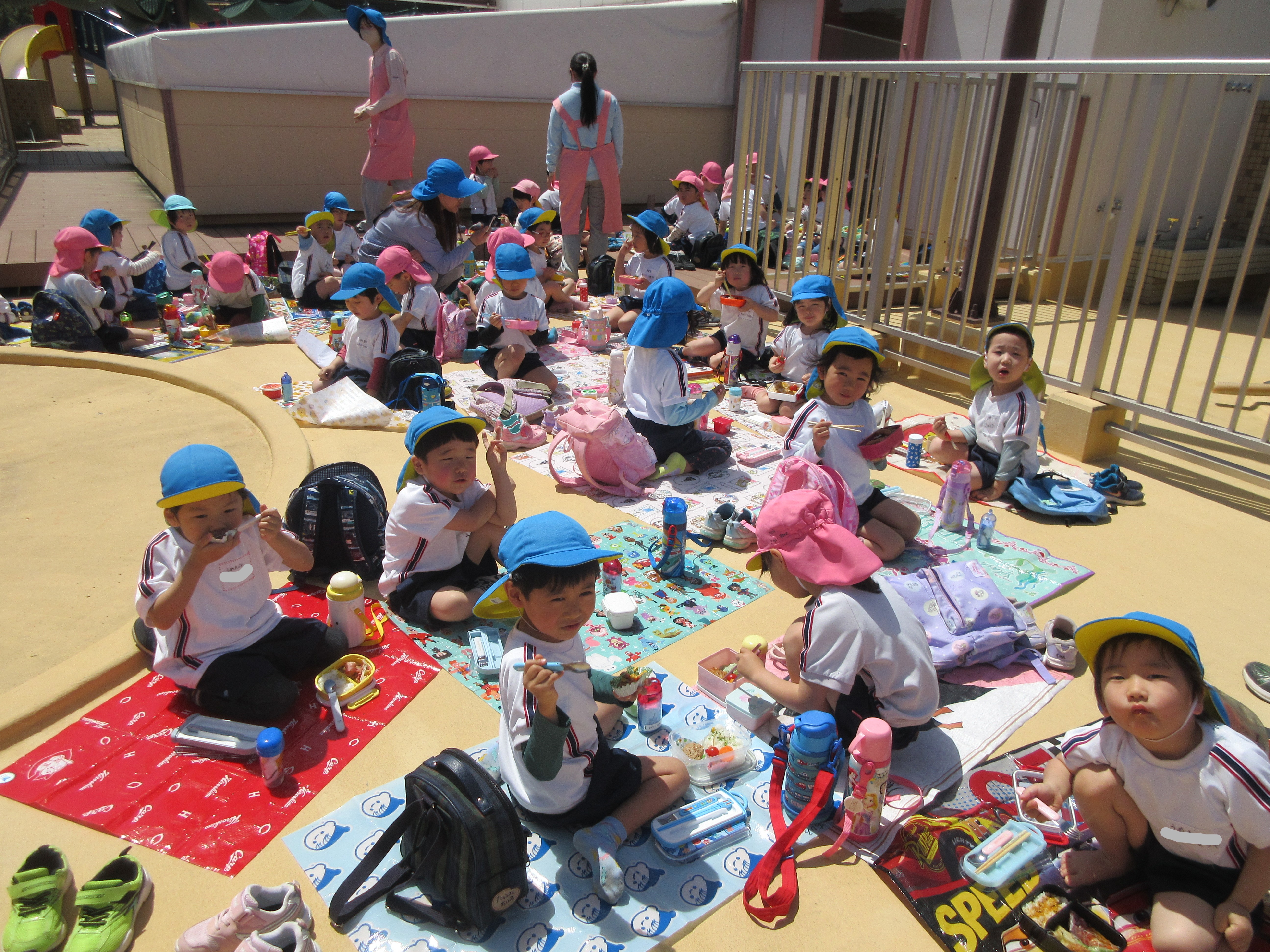 保育園に帰ってからは屋上でお弁当を食べましたよ♪お腹がすいていたので、あっという間でした(^▽^)