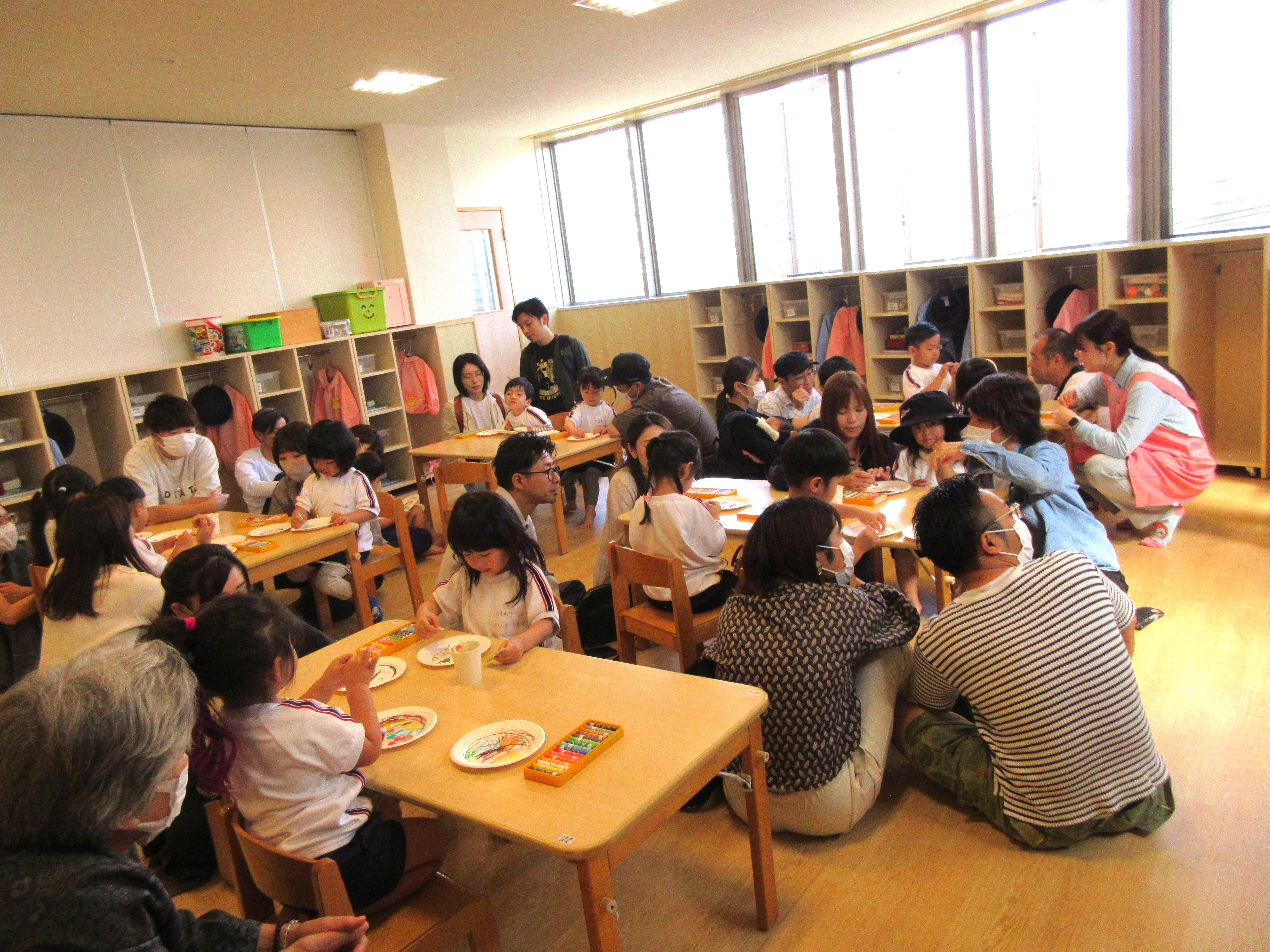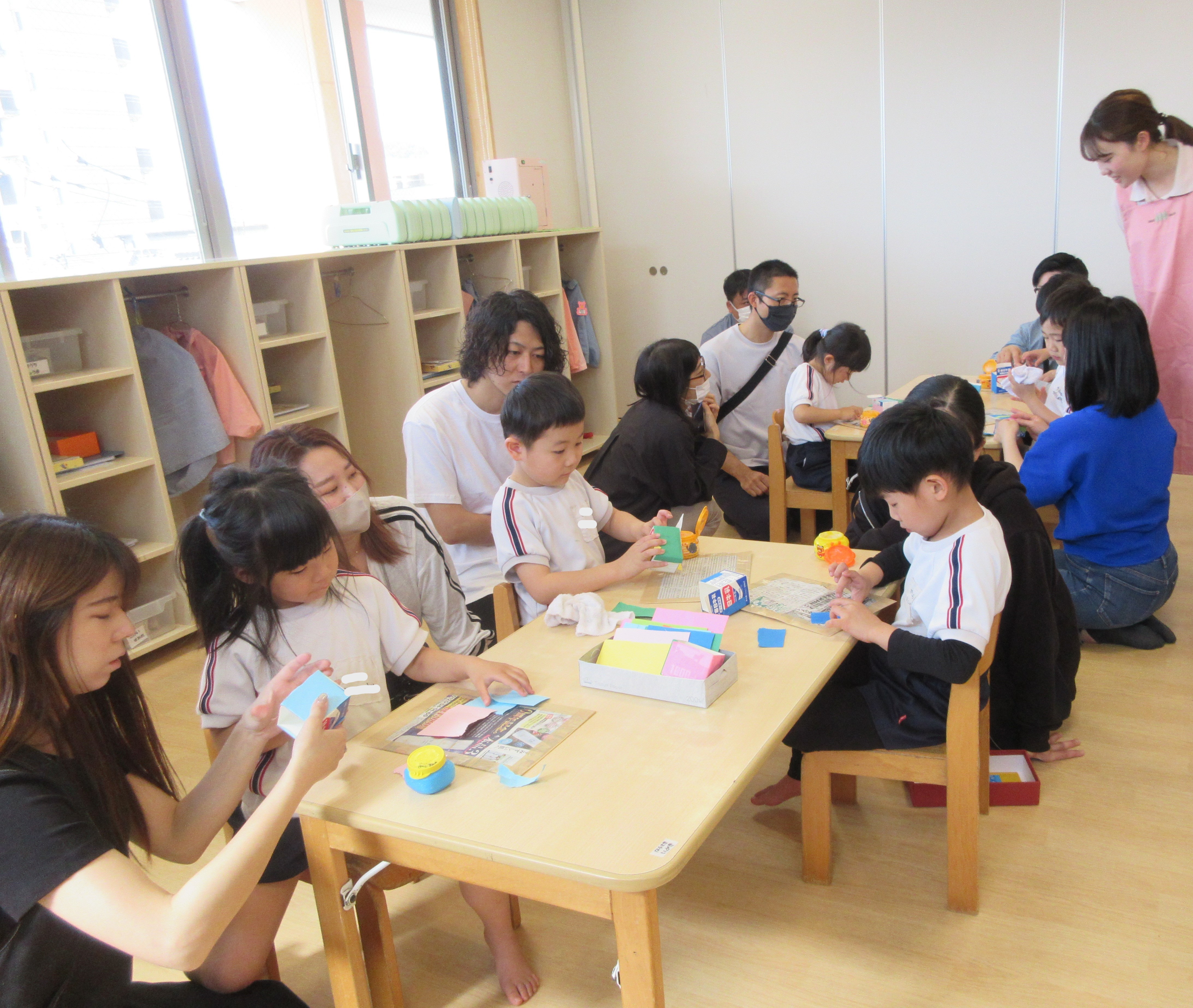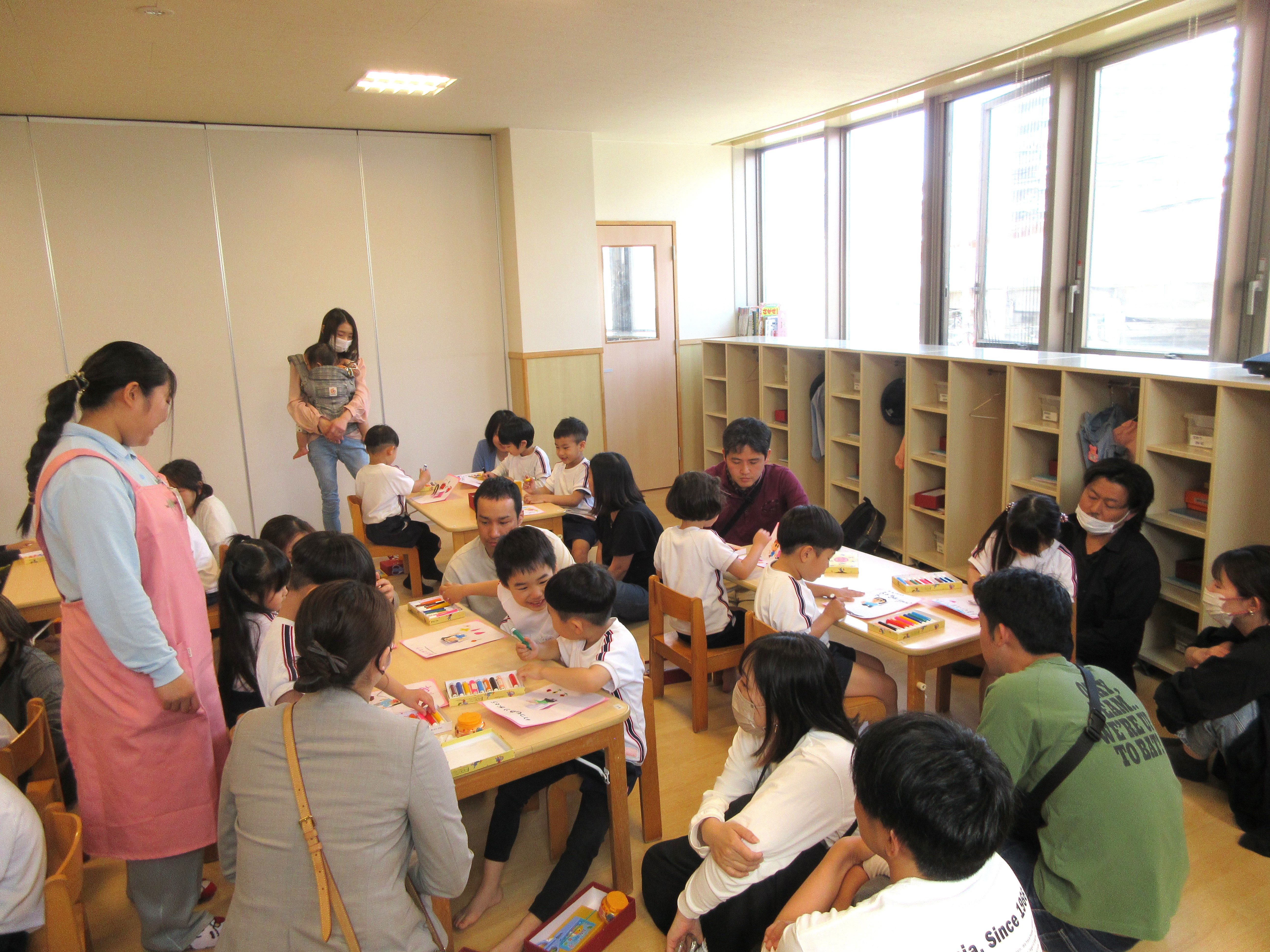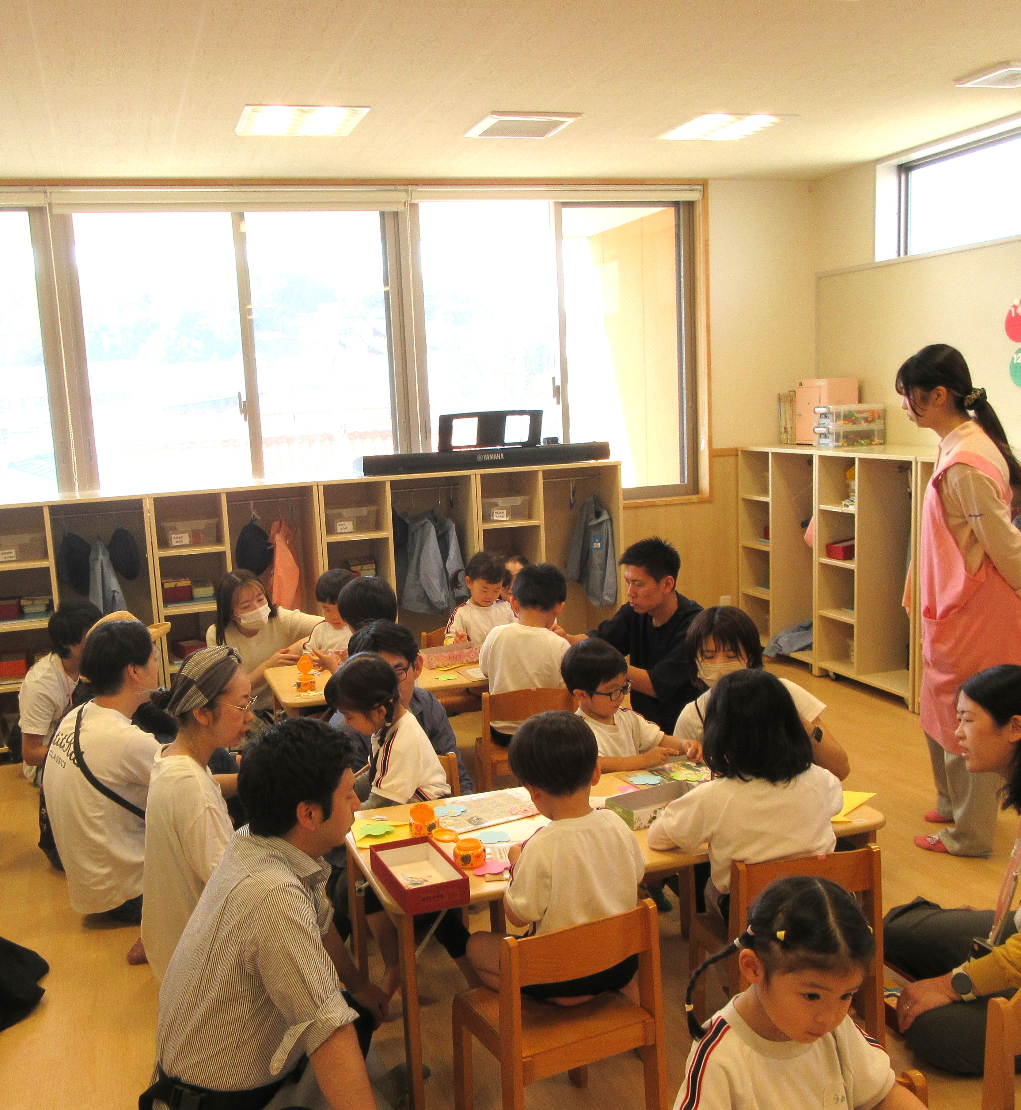 保参観日(幼児組)さんの様子ですが、乳児組さんでは、自分自身がいろんな素材に触れて、指先で感じること、幼児組さんになると子供が保護者の方と一緒に一つのものを作ったり動いたりすることで、楽しみが広がります。