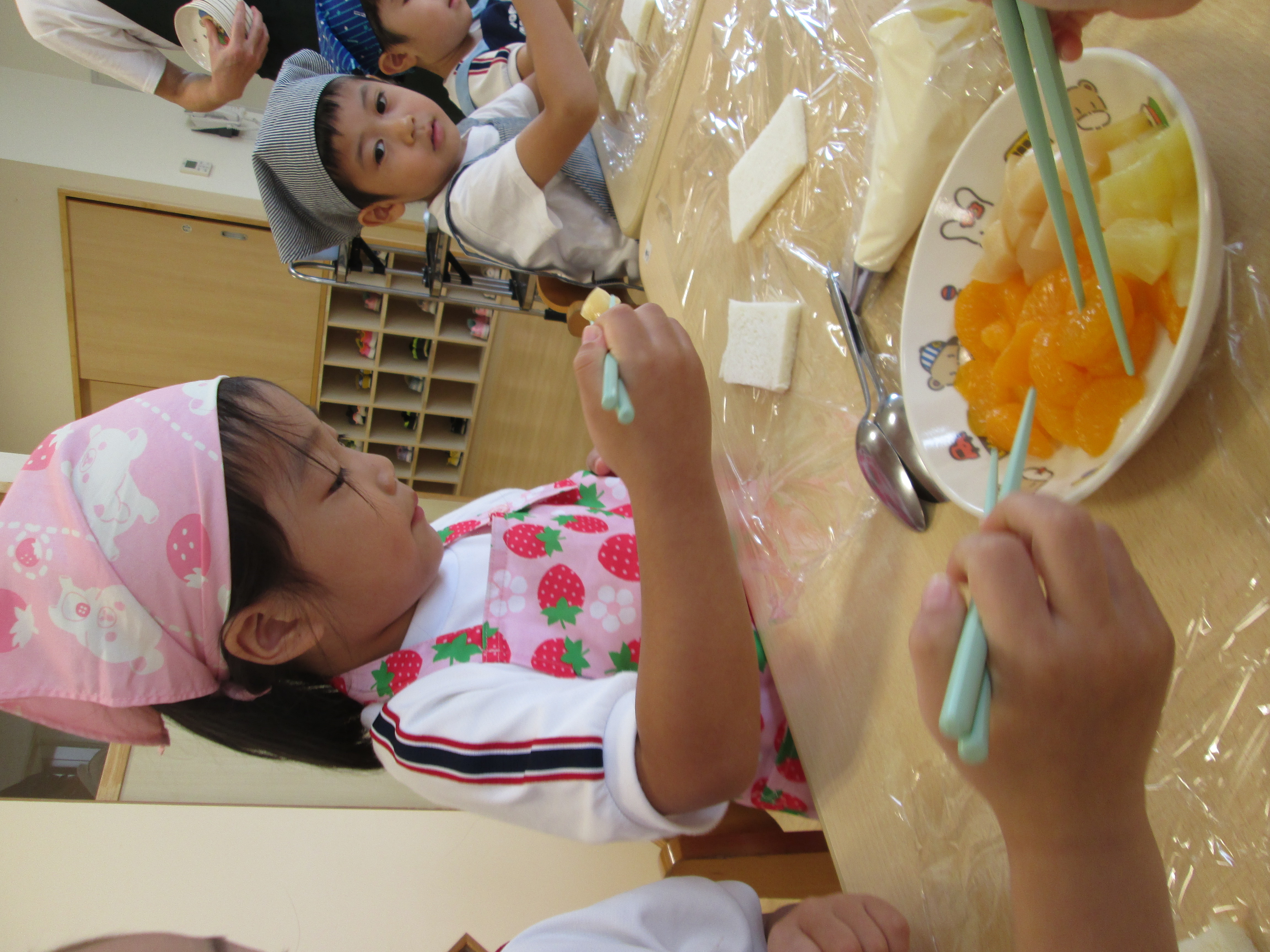 みんな大好きフルーツサンドです。みかんと桃と生クリームを上手に生地に挟んで、自分たちで美味しくいただきました。