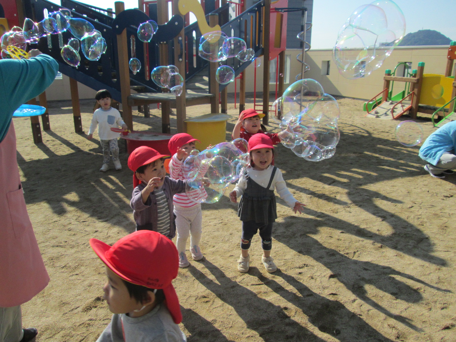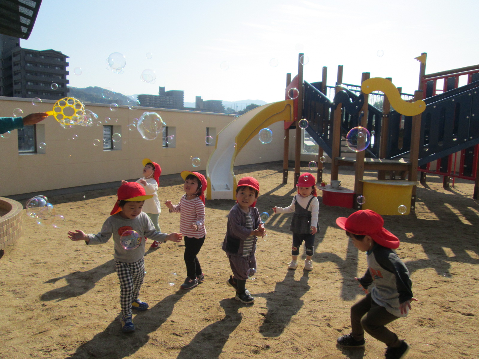 屋上でシャボン玉で遊ぶときは割れずに空に昇るシャボン玉をみながら、笑顔が弾けてました(^▽^)/