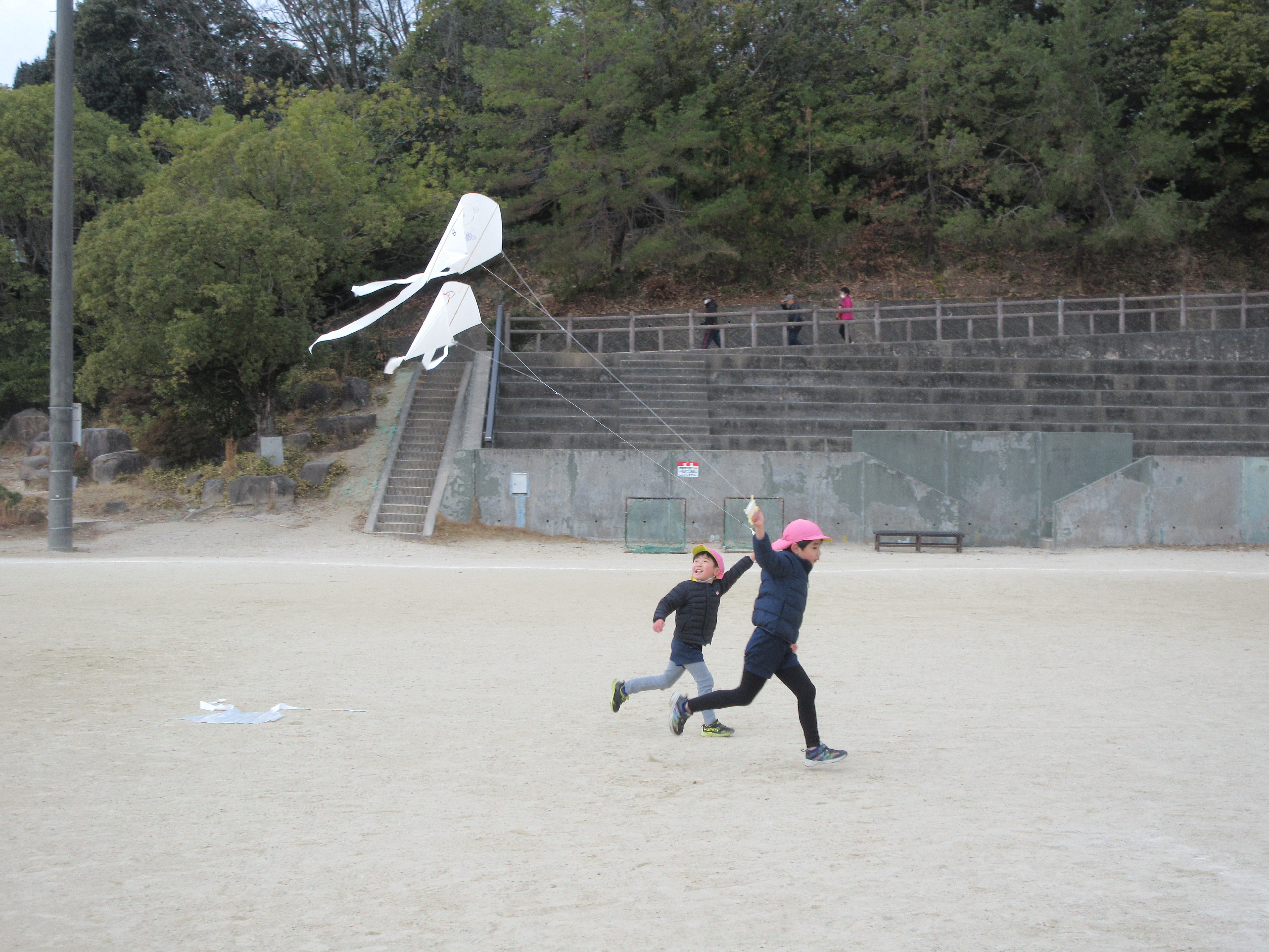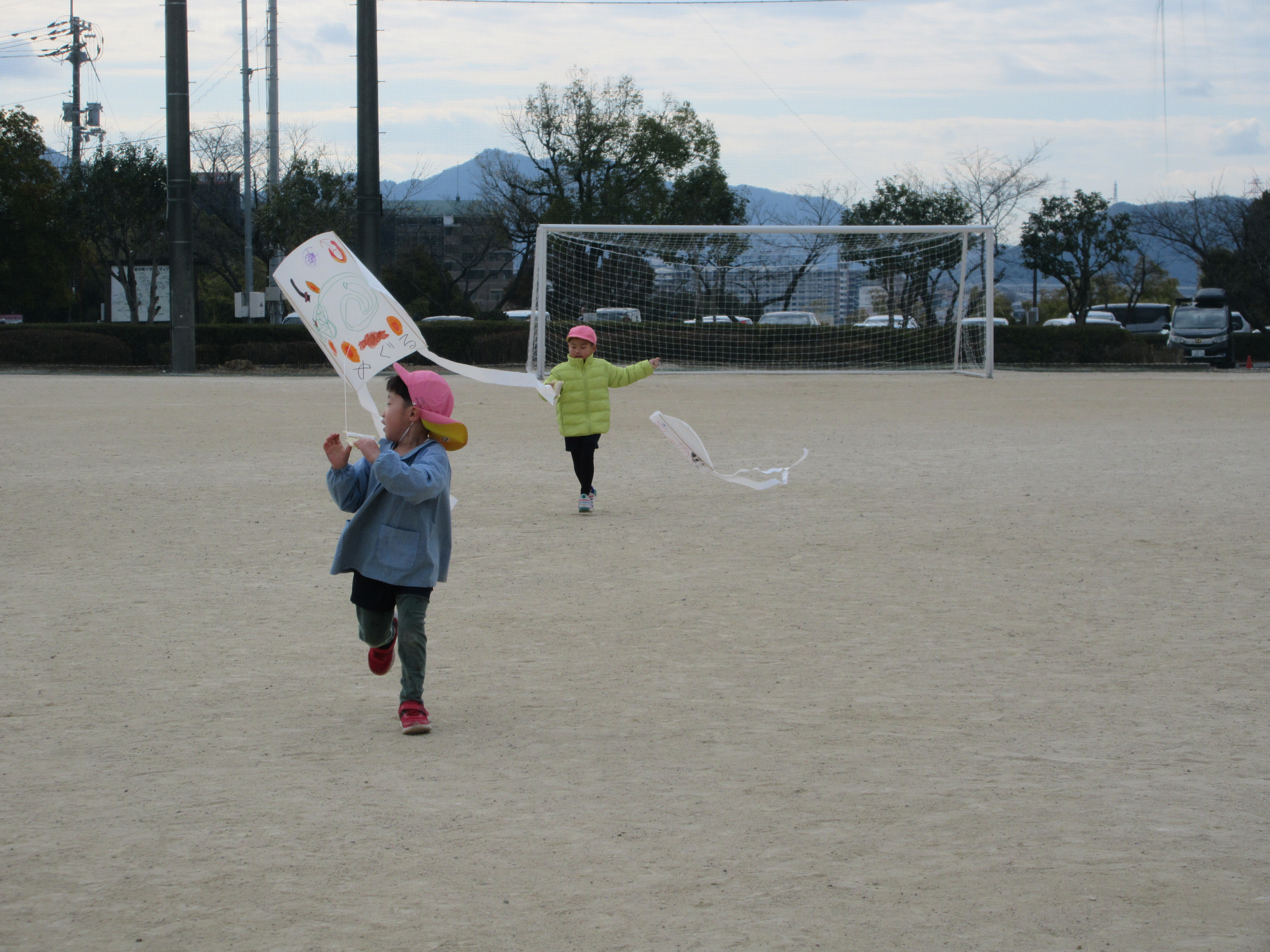 今日は、こんごう保育園とこんごうさくら保育園の年長さんが空城山公園へたこあげに行ってきました。