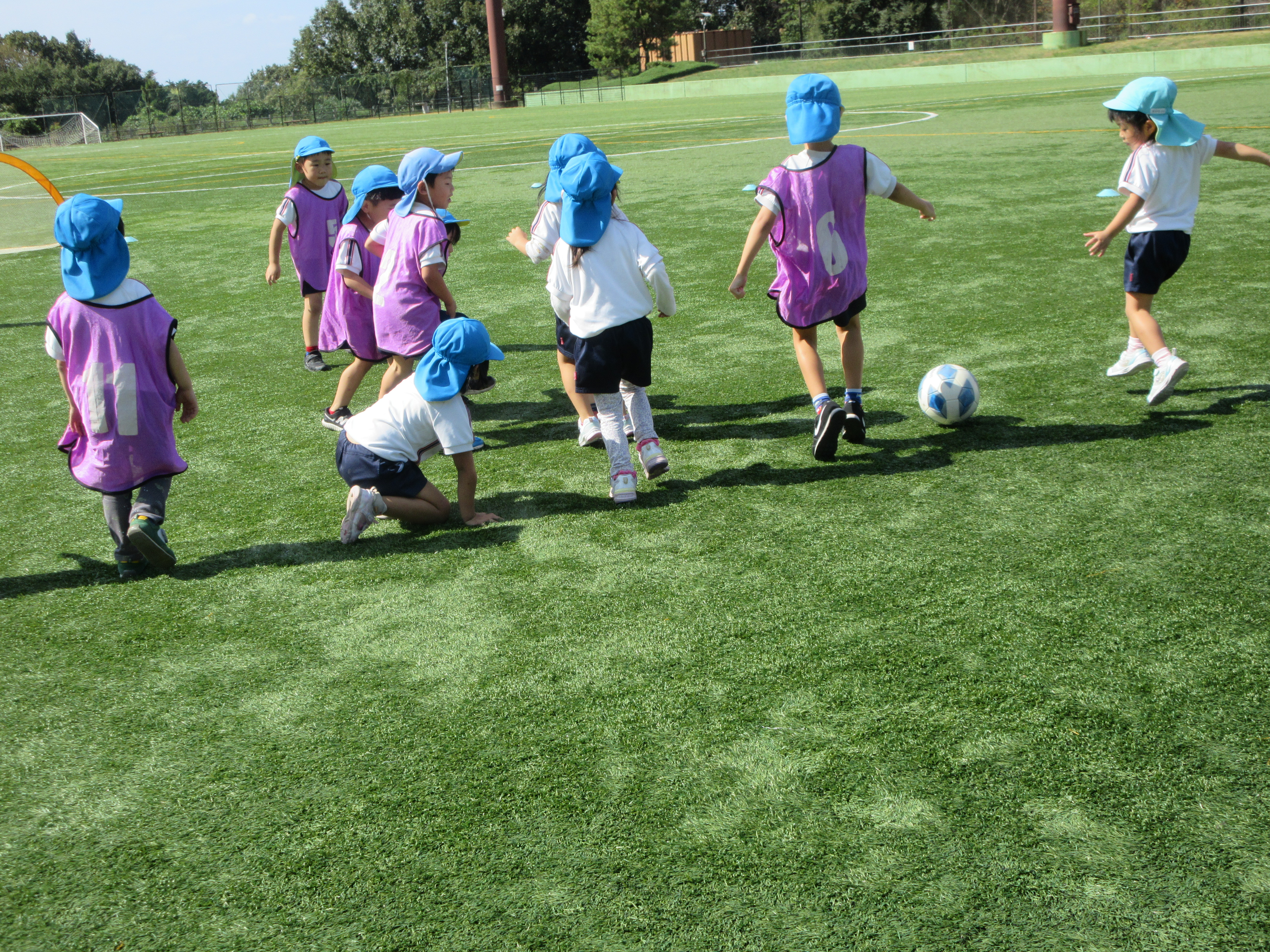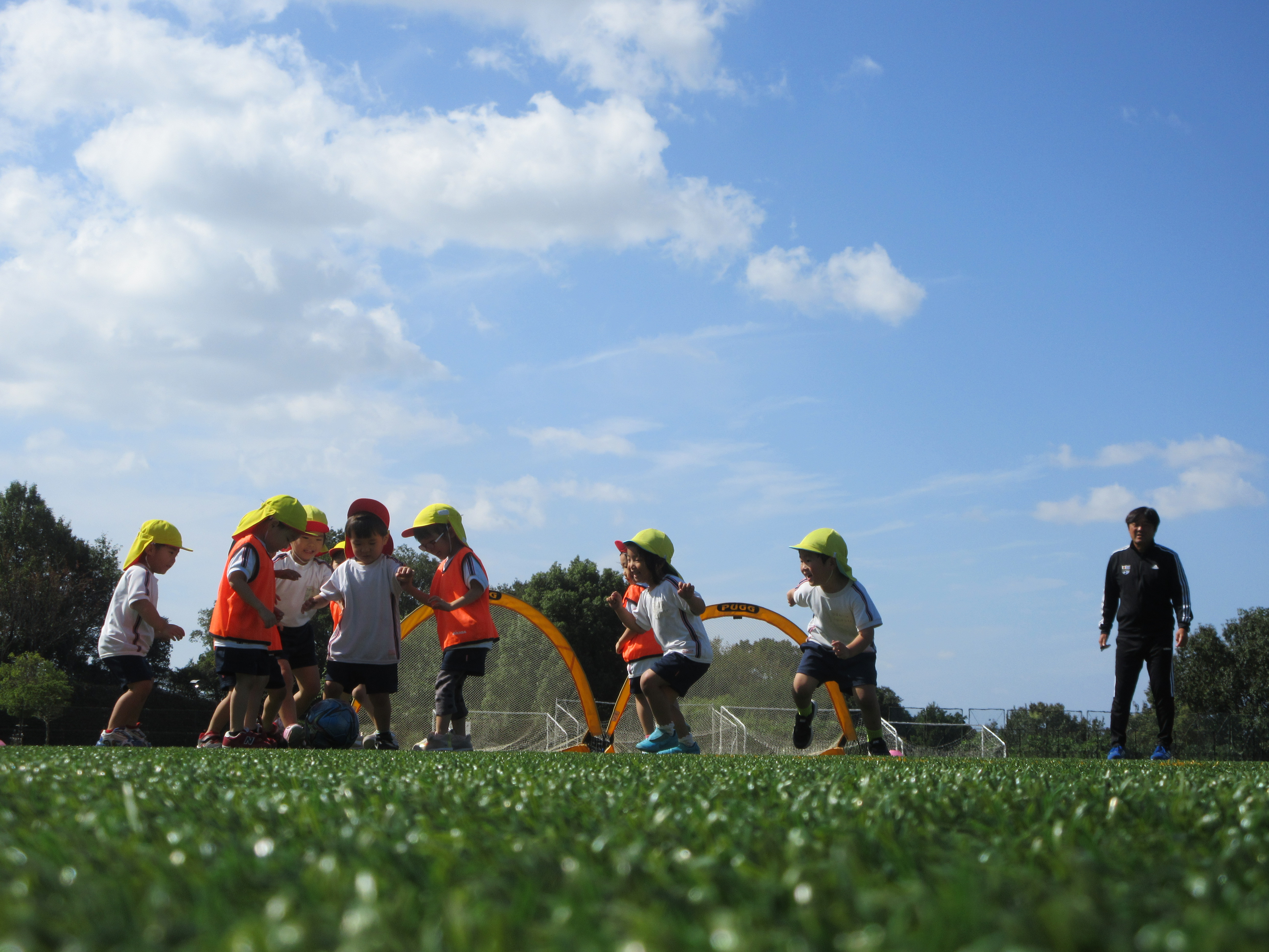 緑が綺麗な広い芝生のグランド♪いろいろな動物のポーズで鬼ごっこしたり、サッカーゲームをしました。