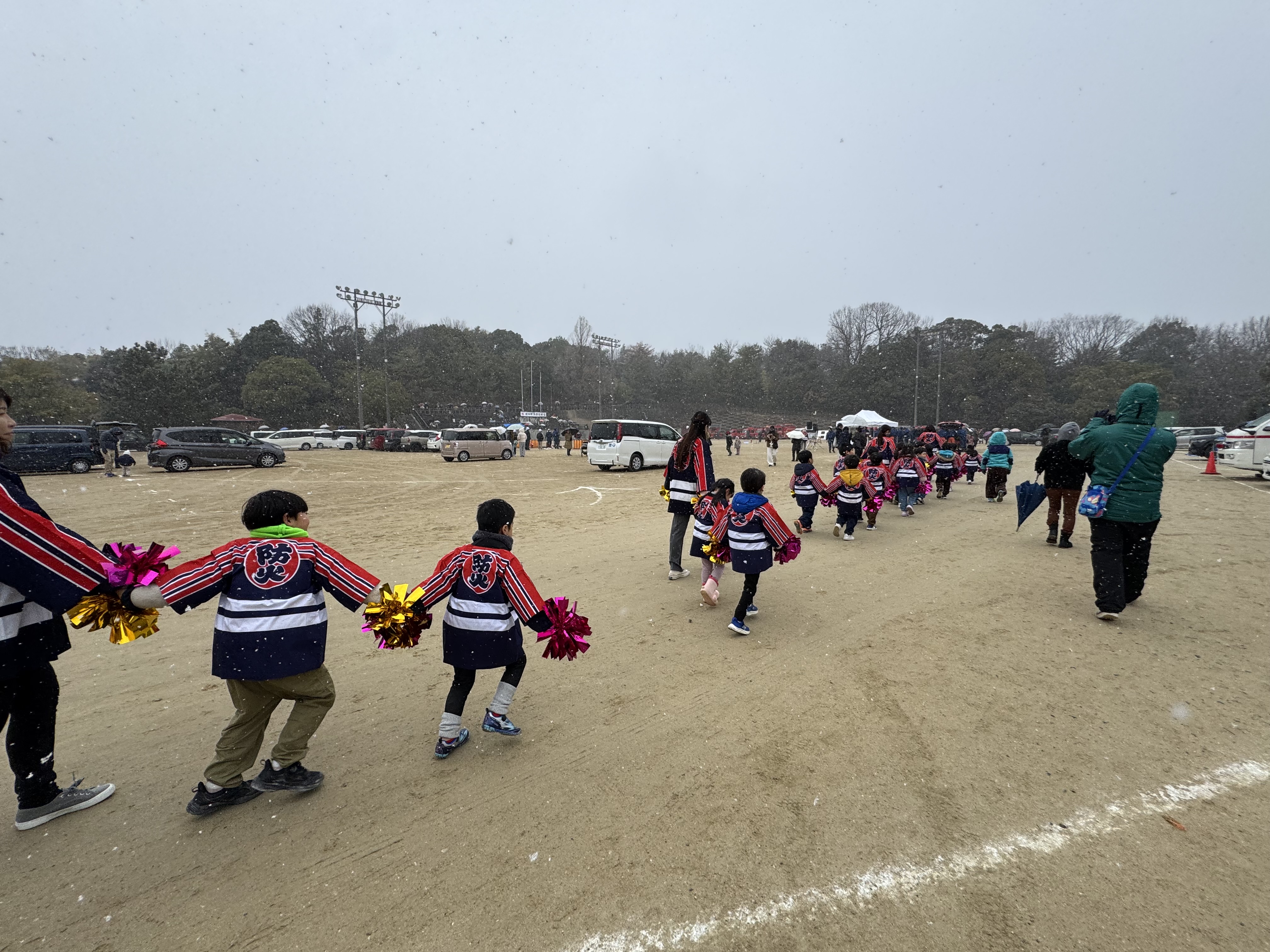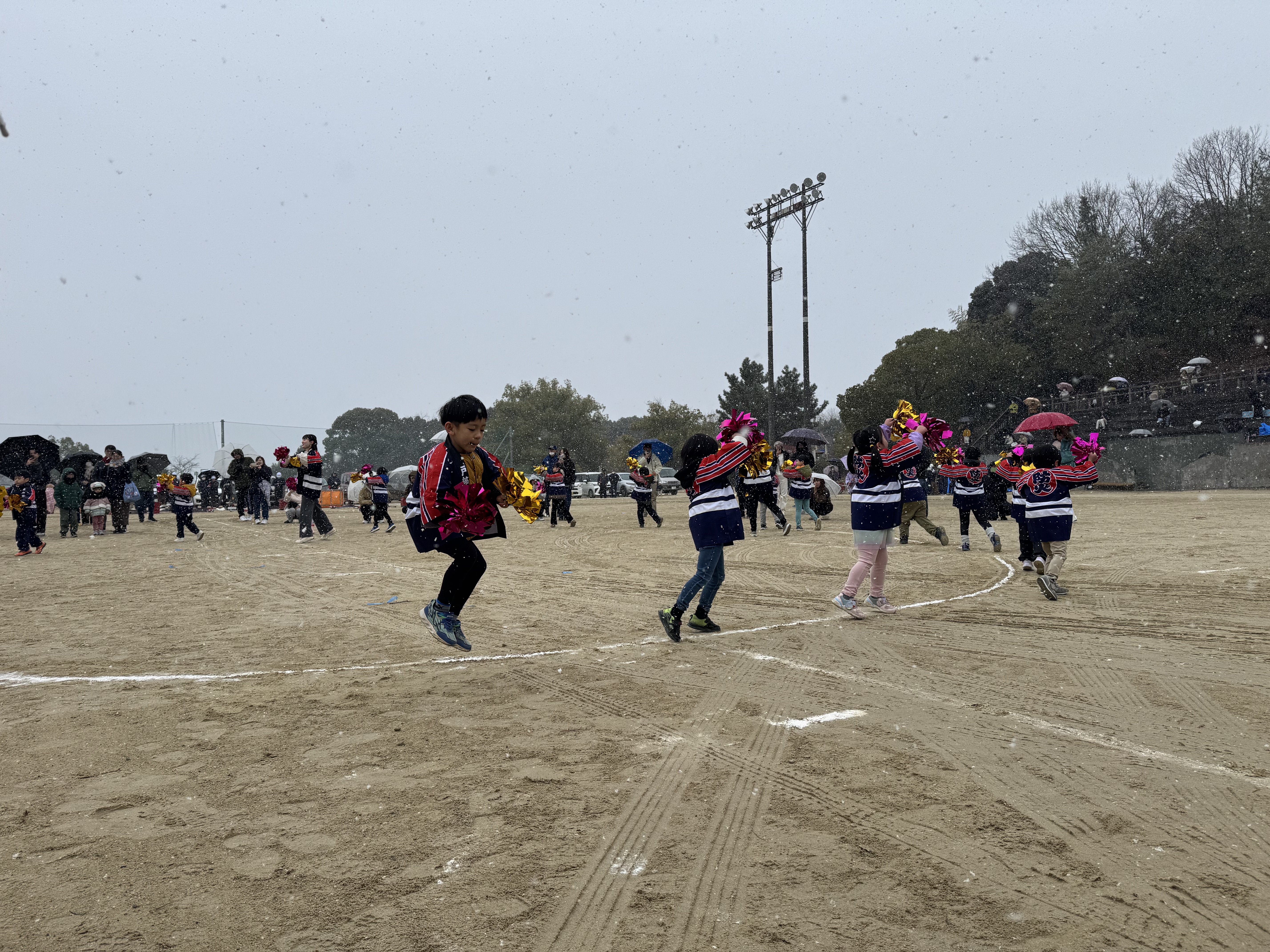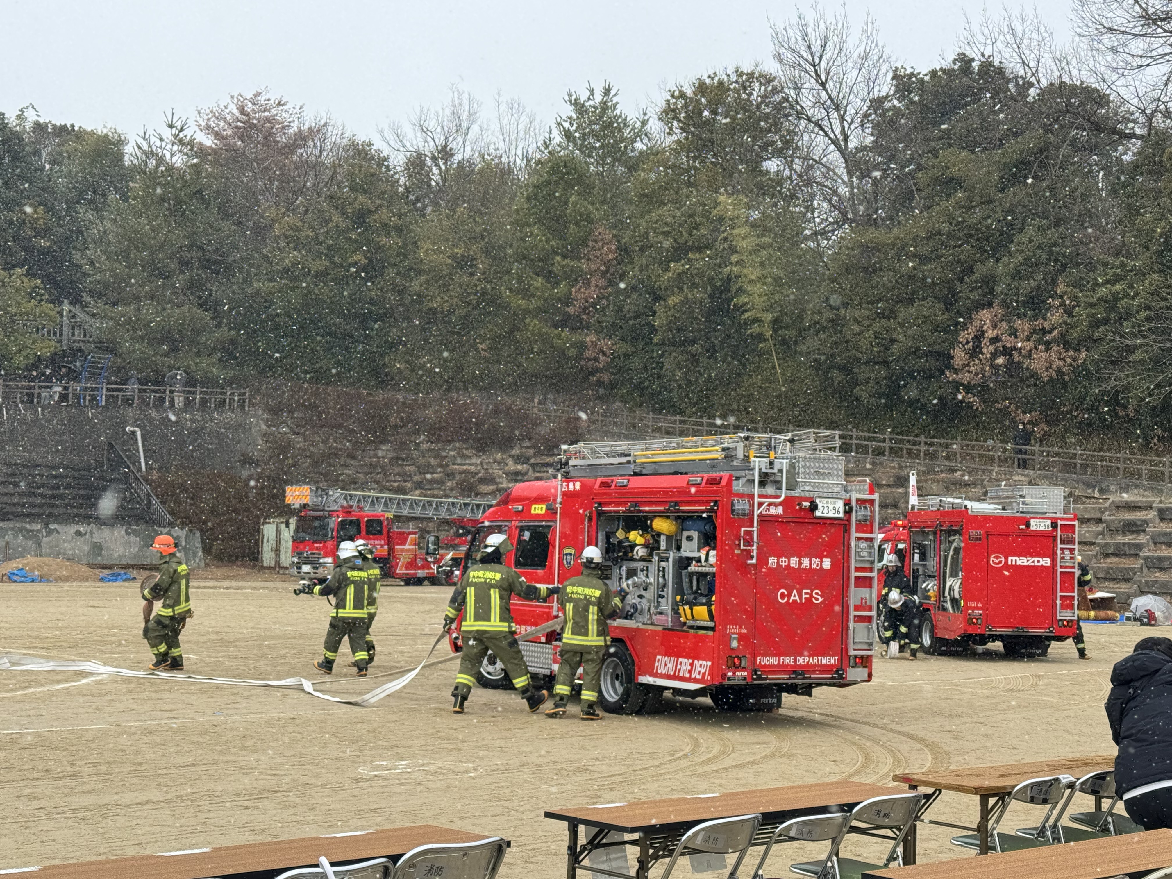 雪の中、こんごう保育園とこんごうさくら保育園の年長さんが出初式に参加してきました。
