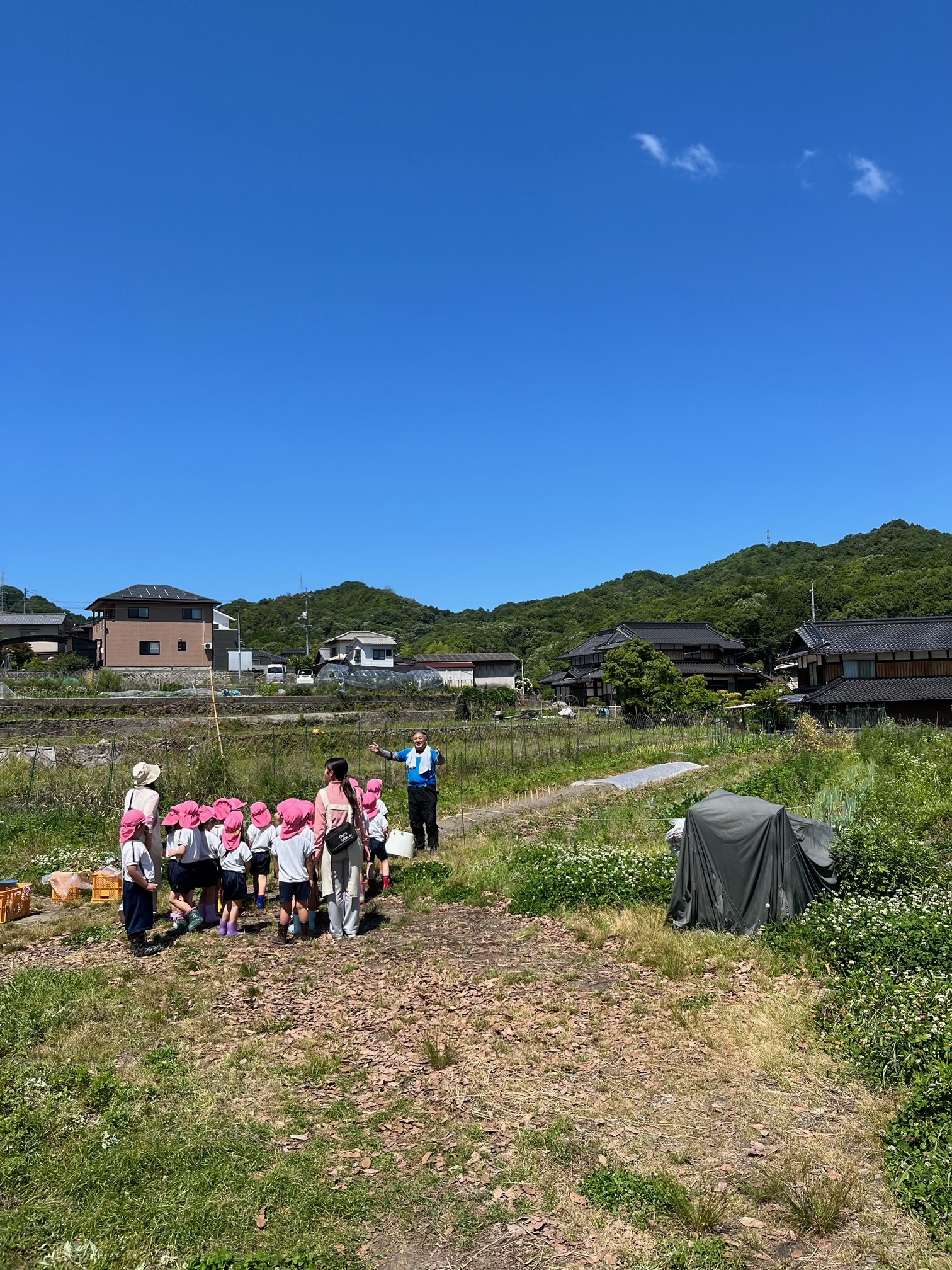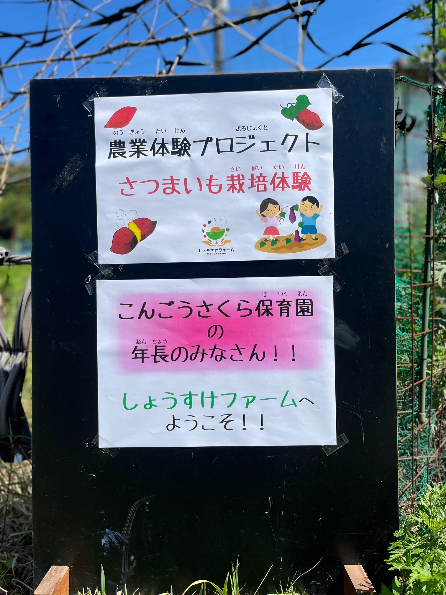 天気の良い快晴となったので、本日は畑賀にあるしょうすけファームに、さつまいもの苗を植えに行ってきました。苗の植え方を教わり、土の穴の中に斜めに入れました。これから しょうすけファームさんに普段は管理してらい、次回はつる返しに行きたいと思います。園児のみんなは秋の収穫が楽しみと笑顔で作業をしました。